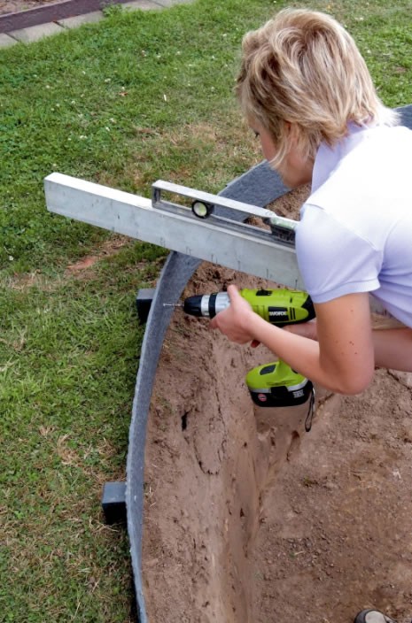 Voor een mooie vijverboord is het belangrijk dat de Ecolat perfect waterpas ligt. Ze bepaalt immers het maximale waterniveau.